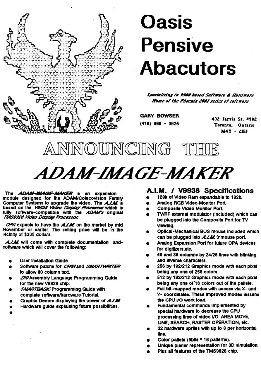 has been placed in both the PRODUCTIVITY and PROGRAMMING directories for conveience. Please note that if using an ADAM emulator, the initial Boot Menu does not display and you will have to press 1 for SmartWriter and 2 for SuperBasic on the blind. Also, it is very important to read thru all the SmartWriter documentation files contained on this disk image!!! |